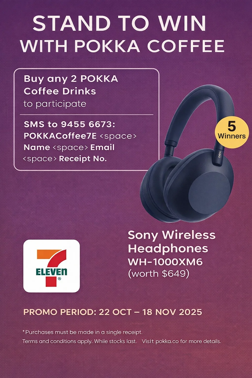 To participate, purchase a minimum 2 x any POKKA Coffee drinks (can/bottle) in a single receipt at any 7-Eleven outlet.